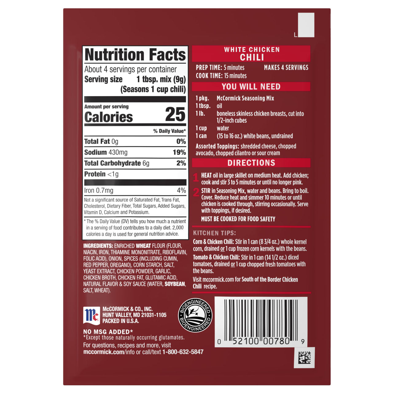 From America's #1 herb and spice brand, McCormick White Chicken Chili Seasoning Mix is an expert blend of onion, cumin, garlic and chili peppers. Ready in just 20 minutes, it's a flavorful, not-too-spicy meal that's perfect for weeknight dinners. Simply add our signature Southwestern style spices to boneless chicken and canned white beans for a chili your family will love. Make it even heartier by adding a can of corn or tomatoes. Serve with fixins of shredded cheese, chopped avocado, chopped cilantro and sour cream so everyone can top their chicken chili according to their tastes. Our chili mix contains no artificial flavors or added MSG*- because your family deserves the very best. *Except those naturally occurring glutamates.