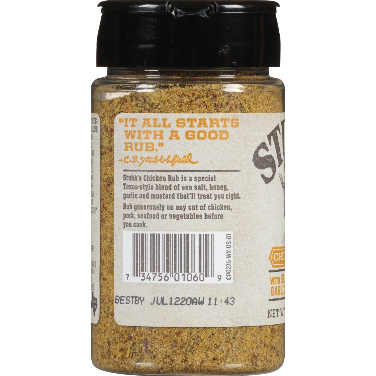 When it came to Bar-B-Q, Stubb would say, "It all starts with a good rub." Stubb's Chicken Rub is a Texas-style blend of real sea salt, honey, garlic and mustard that'll add bold flavor variety to ....
