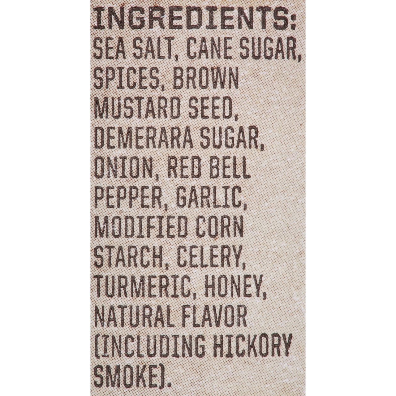INGREDIENTS: Sea Salt, Cane Sugar, Spices, Brown Mustard Seed, Demerara Sugar, Onion, Red Bell Pepper, Garlic, Modified Corn Starch, Celery, Turmeric, Honey, Natural Flavor (including Hickory Smoke).