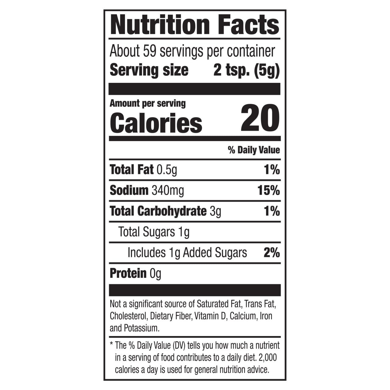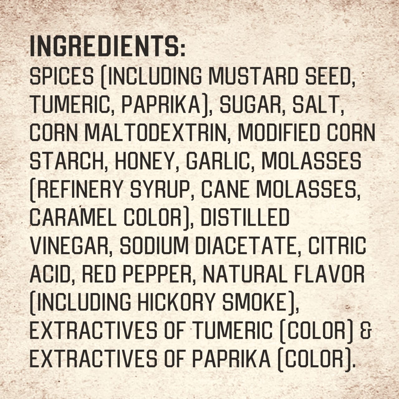 INGREDIENTS: SPICES (INCLUDING MUSTARD SEED, TURMERIC, PAPRIKA), SUGAR, SALT, CORN MALTODEXTRIN, MODIFIED CORN STARCH, HONEY, GARLIC, MOLASSES (REFINERY SYRUP, CANE MOLASSES, CARAMEL COLOR), DISTILLED VINEGAR, SODIUM DIACETATE, CITRIC ACID, RED PEPPER, NATURAL FLAVOR (INCLUDING HICKORY SMOKE), EXTRACTIVES OF TURMERIC (COLOR) & EXTRACTIVES OF PAPRIKA (COLOR).