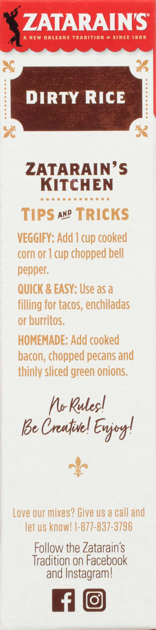This perfectly blended rice mix is an easy and delicious meal. Just add 1 pound of cooked ground beef or sausage and enjoy New Orleans flavor in every bite. Zatarain's Dirty Rice Mix brings New Orleans-style flavor right to your kitchen. This original Louisiana rice mix features long grain white rice, onion and bell peppers with authentic Cajun seasoning and garlic and spices like red pepper and paprika. Serve alone as a savory side dish or make this mix a hearty meal by adding ground beef or sausage, you'll enjoy the flavor and soul of The Big Easy. Give tacos a Cajun kick, or go the traditional route and try it with chicken gizzards and livers. *Except those naturally occurring glutamates